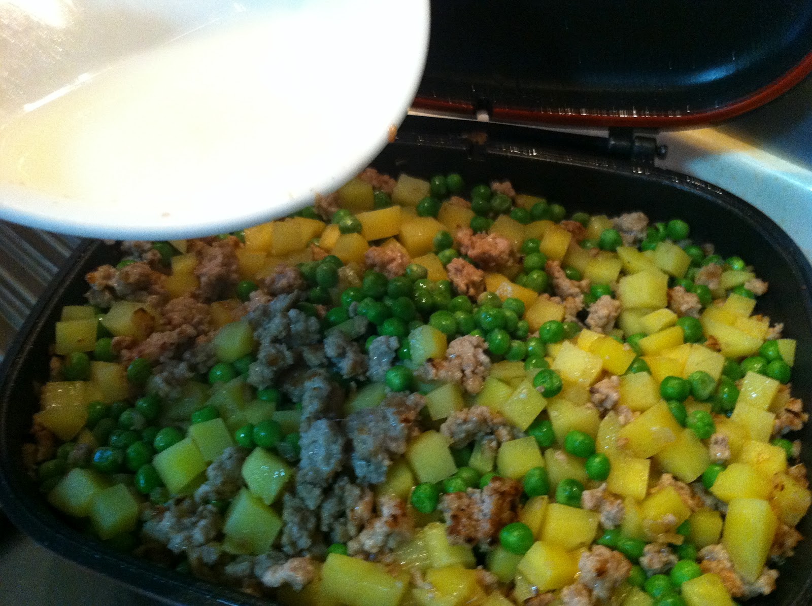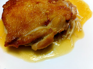 - At the end of 3 minutes, open the HCP to see if the skin is cooked golden. If it is, then use a tong to turn the chicken to cook the other side for 2 minutes. Keep the pan closed because to enable the chicken to cook without drying out. Once this is done, set the cooked chicken aside and DO NOT throw away the chicken oil. (If you don't have a HCP, you can fry the chicken in a normal pan, but make sure your pan is covered to prevent oil splatter. The alternative would be to bake the chicken first, but with the skin side up... but same principle, don't throw away the drippings because that's where the chicken taste is. It might be more work to use a large oven for only 2 chicken legs; or having to clean up a toaster oven for cooking the chicken legs one at a time, which is why the HCP is more efficient for this recipe. ;) )